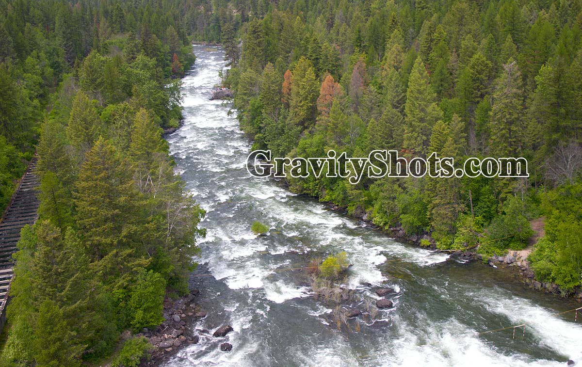 Flathead River exiting Bad Rock canyon Columbia Falls Summer Aerial