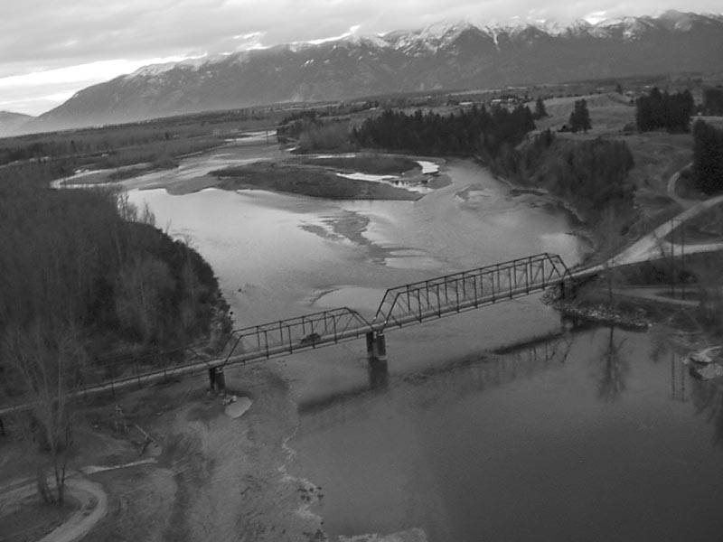 Helicopter shot of Old Steel Bridge Kalispell, MT Winter Aerial