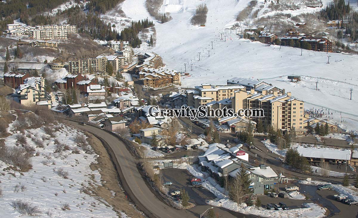 condos surrounding the Christie lifts Steamboat Springs Winter Aerial