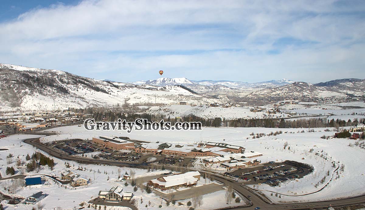 Steamboat Hospital with balloon overhead Steamboat Springs Winter Aerial