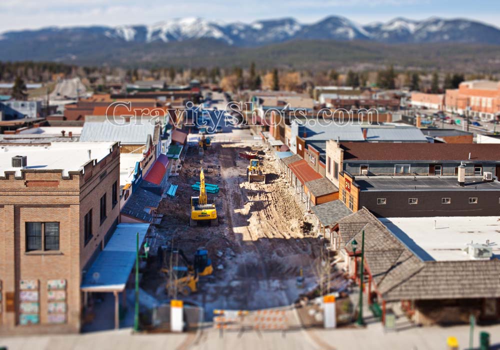 Miniature effect over Central Ave construction Whitefish, MT Spring Aerial