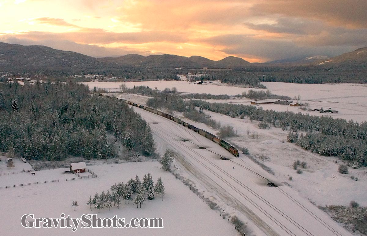 Sunset ChooChoo Whitefish, MT Winter Aerial